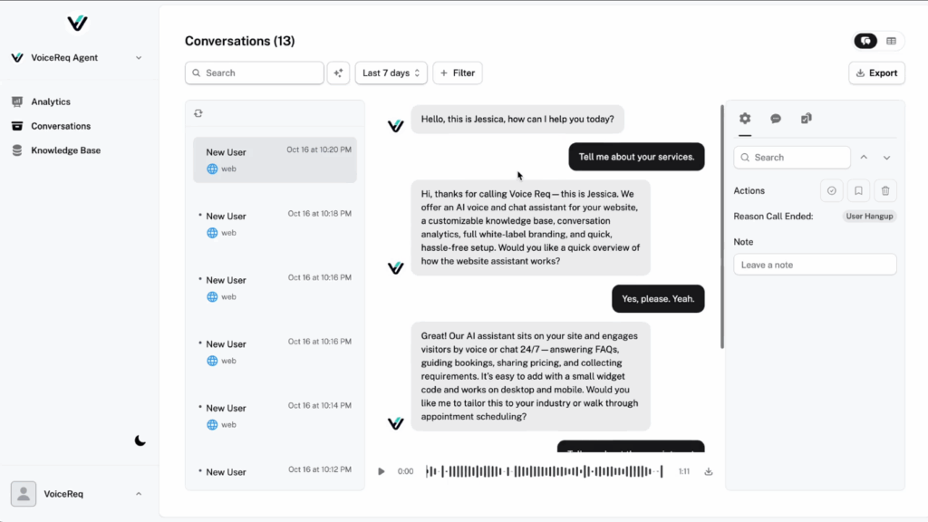 Every conversation is tracked and accessible in your dashboard—with recorded calls, searchable transcripts, and deep analytics to help you refine your service after every client chat.